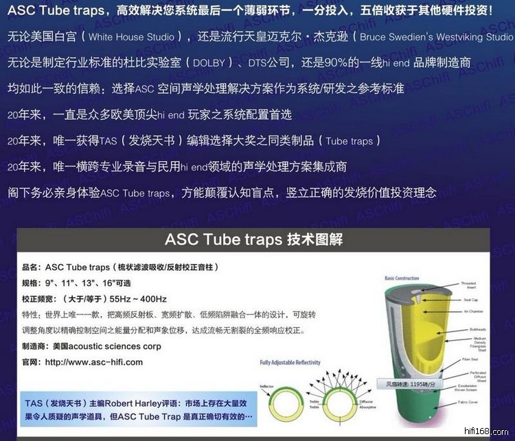 1.从大的理念上,asc把专业录音处理和民用hi end对空间的处理区别,录音室中的声场较为复杂,受房间模式的影响在低频段起伏较大。因此,在整个频段上获得同样的混响时间、较平直的频率响应以及准确反映声像位置的壁面反射特性一直是录音室设计中的首要问题。概括来说就是业内对录音室升学处理公认的规则:(活端死端)End一Dead一End理论2.在传统发烧友的理解中,多年以来,都默认接受了台湾刘汉盛先生的“前硬-中吸-后扩散”,这是在业余条件下,在没有一个较佳比例空间和容积下,对中低端系统的一个定性总结,应该说是一个较成熟的思路,也被广泛接受。但是,当有条件拥有一个独立的听音室,并我们希望更深层次去探究器材本身的原貌,那么这种简单定性的“前硬-中吸-后扩散”,是远远不够的,或者说,缺乏一个具体定量的可操作性。带来的实际问题就是:每个依照这个理论处理的空间,因为材料选择,每个局部的处理程度,整体调声的理解差异,造就千变万化的声音,而且缺乏一个可执行的标准,完全属于空间diy范畴。3.“前硬-中吸-后扩散”成立的主要理由来自:不希望喇叭的后墙吸收较多的功放机力水,这对一些中低端的机器,是有现实意义的。但对于高档系统,显然很多情况是:功放机受制于恶劣的声学环境,远远未能释放出他的最佳工作点,也就是说,音量未敢释放到“黄金功率”的范围。因此,对于更高要求的发烧友和系统,我们需要一个更专业,可定量的声学处理模式,以便更深层次去聆听感受器材的潜力,获取更客观的来自设计师理念的充分表达。4. asc最大的贡献就是,把录音监听的声学处理,和民用hi end的实际情况,作了一个巧妙的平衡,既吸收(活端死端)End一Dead一End理论的精华,也充分考虑到在家居环境下民用hi end系统的主观听感需要。我们可以简单概括asc的hi end系列产品属于“half-End一Dead一End”类别,意思是,他对喇叭的后墙,既是吸收,也是反射,同时还具有宽频扩散特性,并在整体上达到一个较声的平衡,一举解决了其他hifi声学道具没法解决的问题:按照比例去定量控制发射-吸收-扩散,并完成一个整体宽频下的平衡。而传统我们接触到的hifi 道具,都只是针对某一个环节,或者某一个频段做一些初级的工作,他们彼此之间缺乏一个有机的协调工作关系,这给我们的业余应用带来很多变数,难以定量操作。5.如果从更深的层次去理解asc,则远非只是以上的这些,asc 把一个空间里面的声音传递过程,完整而有机的进行细分管理,从asc的产品系列中,我们看到每个部分都是互相配合,并且是模组式的定量协调配搭,最终完成一个对声音发声源-消失的过程的完整处理流程,而这个处理流程中,都严格符合RT60的标准。这个问题我们可以以后逐步深入。6.现在我们先去接触asc处理模式下最基本的东西,也就是他最引以为傲并为90%以上国际一线hi end制造商所采用的道具-- 圆柱型音井,asc tube trap给我们引入一个国内发烧友从来没有接触过的理念,而这些理念早在20年前已经为众多录音室,著名的hi end制造商所接受:一个具体聆听空间里面首要解决的 head-end ringing(头端振铃)。通过清理头端振铃,极大地再现低电平下的细节中端和高音。asc认为,发烧友在传统业余条件下吸收第一次反射点虽然改进了结像,但没有治疗头端振铃,有这种无处不在的纵向和横向的空气震动,there’s this slug of vertical and lateral shaking of air that oozes past the listener about a twentieth of a second after the direct signal and blurs musical detail and imaging. After we’ve addressed head-end ringing, then we control first reflections(需要您自行翻译理解).7. 如果说,传统依照“前硬-中吸-后扩散”处理的聆听空间是一个业余diy式的声学环境,那么asc 提供一个hi end级的成品可调空间处理解决方案,并成为众多hi end 制造商选择的产品设计参考。很值得高要求的发烧友去体验高档器材的原貌。 以下是多年以来,一直采用ASC声学解决方案作为产品开发参考标准的厂商(录音室)名单: