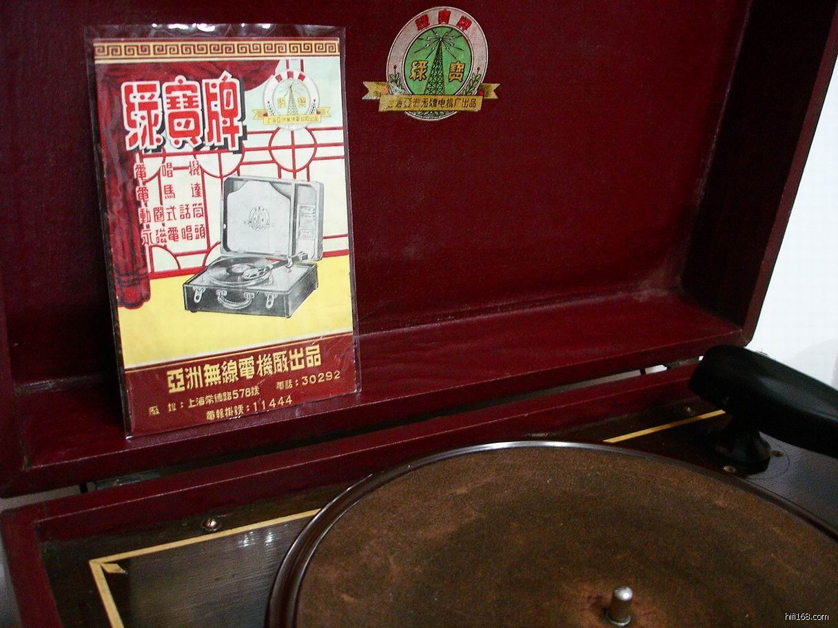 民国35年,上海亚洲无线电厂为响应“抵制外货,爱用国货”的号召,开始仿制单速电唱机。该机参考国外样机,自制单相罩极式电动机及磁极式唱头,年内开始批量生产,商标定为绿宝牌。由于该唱机系国内自产,又属首次上市,产品质量稳定,受到消费者欢迎,购买者大多为文艺界人士。1953年,上海五金交电公司对绿宝牌电唱机实行包销。1952年12月,上海唱片厂利用上海百代唱片公司遗留下来的模具和库存零件,生产发条驱动式唱机——中华牌101型手摇唱机,当年生产256台。中国唱片厂手摇唱机到1956年停产,累计生产390389台。