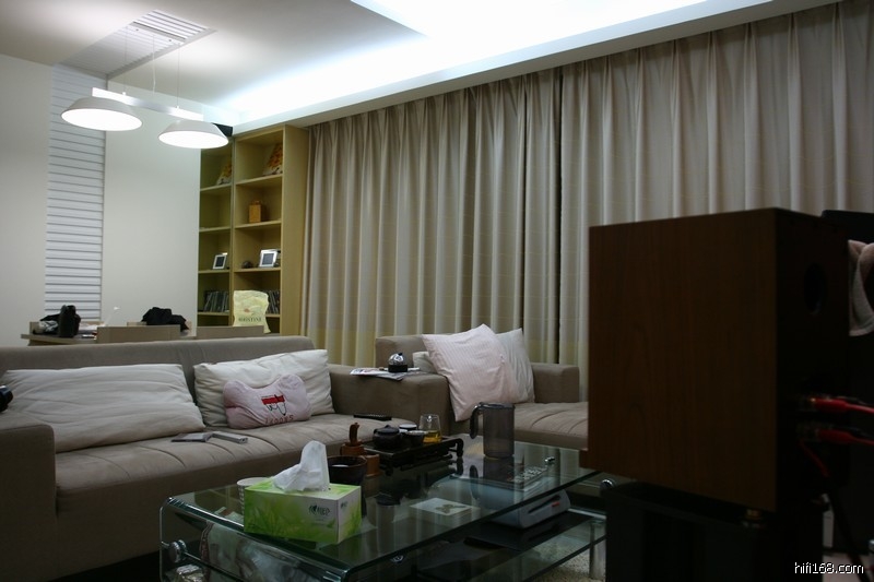 客厅长5.4米,宽3.9米,高2.7米.左右墙面完全不对称,还有餐厅部分有大量吊顶空腔.厨房门为全玻璃结构.茶几也是大型钢化玻璃.地面压光瓷砖铺设,以上是不利面.空调柜机(相当于一个驻波消除器)布艺沙发,左面全墙面窗帘,左后方连体落地实木陈列架,右前方(放饮水机的地方)结构为结实的木工板空腔,茶几下面是3CM厚地毯,全实木餐桌,这可能是有利面