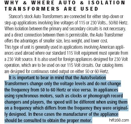 以下是美国变压器厂商产品说明书里面的内容,看来HZ数对CD机确实有影响啊