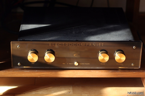 ECI-2承袭了家族中大哥们的外观造型,采用超厚的有机玻璃来制作面板,并以黑色油漆作衬底,再配上金色旋钮和两个金灿灿的把手,机器工作的时候旋钮上面还有小小的发光蓝色二极管作点缀,整体上透出一种典雅高贵的气息。ECI-2虽然在其家族当中属于便宜货,可在用料上一点也不吝啬,调节音量和平衡的电位器是名牌ALPS,输出功率管使用了东芝的大电流音响对管2SC3281/2SA1302。电源部分也很下功夫,一个大大的环牛不说,总容量20000μ的滤波电容使用了高级的ELNA,另外还有十来只容量小一些的电容也全部采用ELNA。据厂家提供的技术资料,ECI-2在供电线路的设计上采用了一种称为“悬浮变压器供电技术”(FTT)的独门绝技,可以比常规的接线方式提供大一倍的电流。