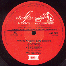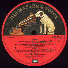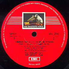 EMI HMV STEREO 2nd Label: Semi-circle , Black/Red Dog,在中間圓洞上方有一半圓形的狗,狗的上方有白色粗體字的HIS MASTER'S VOICE,俗称半月狗