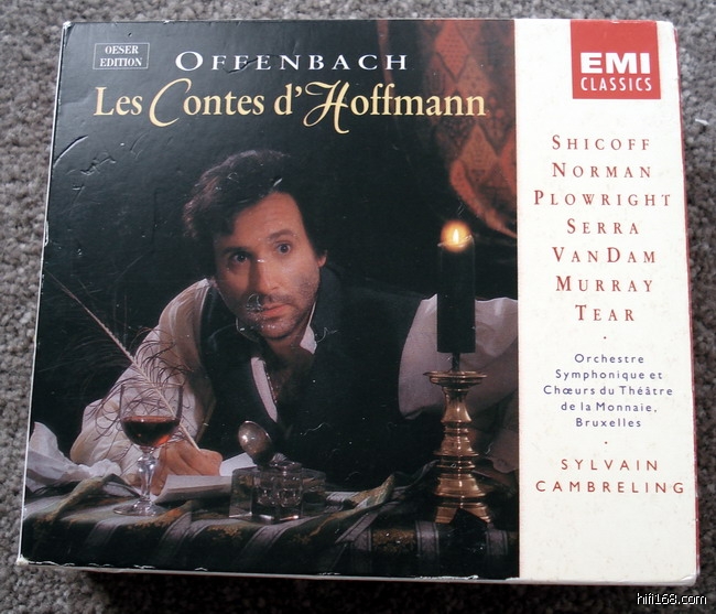再说唱片版本,我的这套Cambreling指挥的录音采用的是比较完整(也可能是最完整)的欧瑟补完版(Oeser Edition)。市面常见的另外两个版本——克路易坦和邦宁吉的版本都是两张,而这套是三张,并且是比较满的三张。另外根据作曲家的意愿,剧中的三个女主角——象征女性的三个侧面——要由同一位女高音担任。很多录音版本里也是这么做的。但实际上这三位女角的脾气秉性全然不同,因此对演唱要求的重点也不相同。Olympia的唱段突出花腔和高音,Antonia的部分强调抒情,而Giulietta的部分戏剧的成分比较重。要同时胜任这三个角色,对歌唱家来说是个很大的挑战。我感觉就算能勉力唱下来,效果也很难达到理想,所以不如用不同的人来唱。我的这个录音就是采用这种方式,我认为效果很好。如果不这样的话,让Jessye Norman以她那肥厚的嗓音去唱冷艳的Olympia或者柔弱的Antonia,那效果,噫~简直不堪设想!