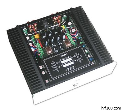 此功放为双声道结构的全对称电流负反馈式甲类功率放大器,具有强劲的驱动能力,其峰值输出电流达51A。电流放大级采用三级达林顿结构,输出功率管是每声道三对三肯的2SC3264/2SA1295大电流对管。主电源滤波电解电容采用总容量为82000uF/63V的红宝石电容,两只大功率环形变压器。