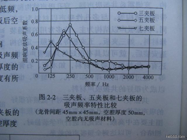1。 木门本身不是刚体,是薄板共振结构,薄板薄刚度差,共振频率就高(作为吸声体时,吸声系数就大)。为了将影响降低到最小,门的内部是没有空腔的,让厂商在木框中间全部垫实蜂窝夹心板(门的厚度按夹心板的厚度凑的)。面板我提出用10毫米的夹板,不过厂商说那样太麻烦,价格要贵很多(我是找的普通木门供应商),我只好屈服了,只用了三夹板,还是没钱。厂商加工后直接送来的,我没有看到实际的内部结构。收到后,感觉还是满意的,面板的刚度挺大的(可能是因为里面的蜂窝夹心板是垫实的,没有空气层),我感觉和10毫米的指接板差不多,但谐振点具体多少,真的不敢讲。顺便贴张图,是关于三夹板,五夹板和七夹板在龙骨间距45X45毫米时的吸声系数(空腔内没有吸声材料),吸声系数的峰值点就是薄板的共振频率。