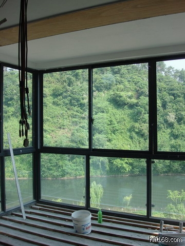 是阳台, 深度1.8M, 全部玻璃窗. 在阳台处拟安装4扇开门. (边上2个门固定, 中间2个门向外(向阳台)推. 门的上半部为玻璃--考虑采光; 下半部木门+软包).