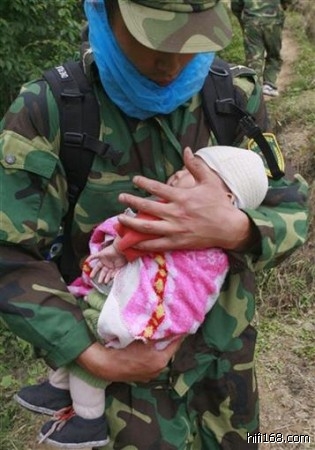 5月15日,北川县,一名战士抱着刚刚获救的婴儿。这个孩子的母亲在生命最后时刻用身体护佑了4个月大的孩子(2008/5/23 23:27:55 上传)