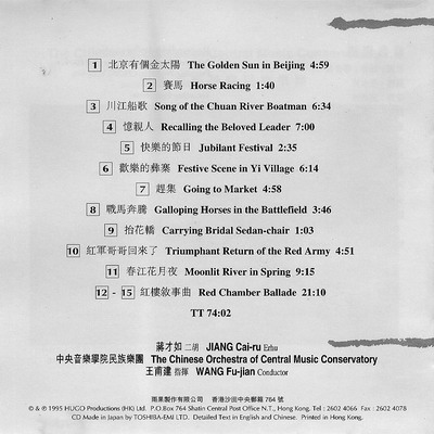 《北京有个金太阳》雨果公司于1995年出品。是由蒋才如先生任二胡独奏、王甫建指挥中央音乐学院民族乐团演奏的一张不可多得的演录俱佳的好唱片!此唱片多首作品出自蒋才如先生之手,早在六十年代就读大学二年级时,蒋先生创作并演奏的《北京有个金太阳》就风靡全国,其演奏的《赛马》《川江船歌》《战马奔腾》等二胡曲犹如一幅幅交响音诗浮现眼前,听一首《抬花轿》你能体会出抬轿人上下颠簸花轿时的幽默和活泼的景象。易先生的录音深深抓住了蒋先生演奏的神韵,把一部部作品完美的展现在我们眼前,这是一张不可多得的民族音乐唱片,录音也完全达到试范效果,即使不听音乐的人听到这张唱片也会喜欢上这张唱片的,因为这是我们自己的音乐。