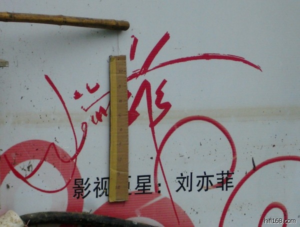 今天回看那天拍的图片,发现其中的一张广告牌拍了两张片子,且水位相差明显,再查看拍摄时间,相差81分钟。原来一张是去水东门路过时拍的,另一张是回来时拍。突然灵机一动,心想能不能利用它推算出水东门水位记号的正确性呢?因为松香味兄用了权威数据来说明它不够准确。我虽然不同意他的说法,但没有直接的资料。现在有了一个线索,就试一试吧。但一个重要的依据还没有----广告牌上的最高水位。想到这里,立即出去看一看,果然看到了广告牌上最高水位清晰痕迹。马上回来做了个刻度尺,带上相机,叫一同事一同出去拍照。