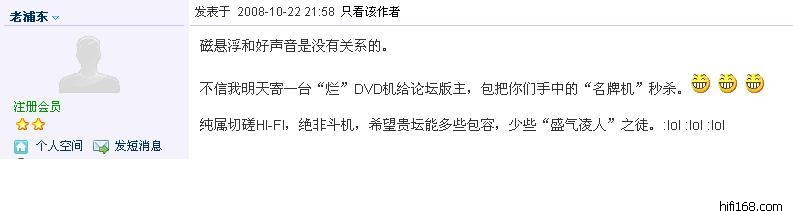 原帖由 老浦东 于 2008-10-24 11:45:00 发表任何DVD用都有效。但在中国DVD已经做烂了,很多鸡鸡都“偷工减料”得很,根本不考虑音质,所以效果要比松下差。松下不摩也有过得去的声音,摩后声音足以满足一般发烧友的声音要求。
