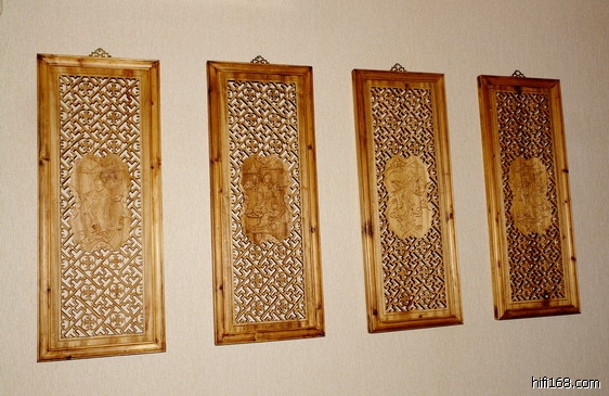先接昨晚的预告,说说天花,这个天花,前后咨询过多位DX,主要是打听格子的尺寸,最后确定内框是15*15CM,用料是进口实心水曲柳原木,耗材大约一个立方,总重量超过1000斤!安装这个框框的当天,场面还是比较“壮观”的,要10个木工一起“发力”才行,最后用粗钢绳吊挂在台底,再固定好四个边边。而四周的包边天花就用了12MM*2的优质甲板,一来美观,而来是吸收上空多余低频的,整个天花可谓固若金汤,几乎没有谐振。
