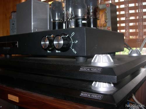 音乐传真的垫板很不错,我一口气买了三块(lesss前后一起共买了5块、聂总2块、wlss1块、liuchu摹拍2块、刘处1块。几个人一起累计14块,哈哈js高兴了),前级一块再加声美丽檀木带沙木钉,cd机两块,承板下都放了绿色绒布(据说有好处),后级和音箱用的都是声美丽的垫板,根据器材大小定制的,音箱因为有转轮,故加放了墨玉象棋子承垫,我试过,这墨玉比高丘的垫好些。