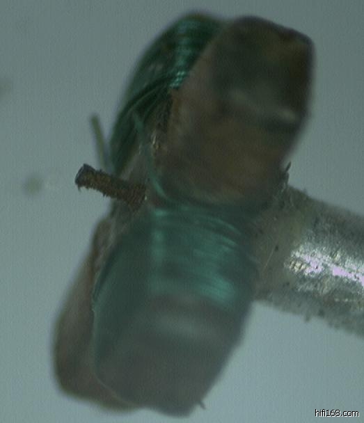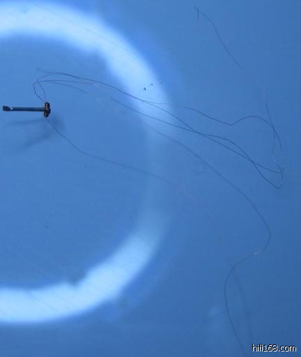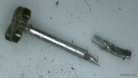 可能是使用不当与当地潮气太重,打开头已锈蚀非常严重,并吸进大量铁屑。过多的铁屑将线圈挤压收到时已有一组断掉,唱针被夹的破裂严重变形