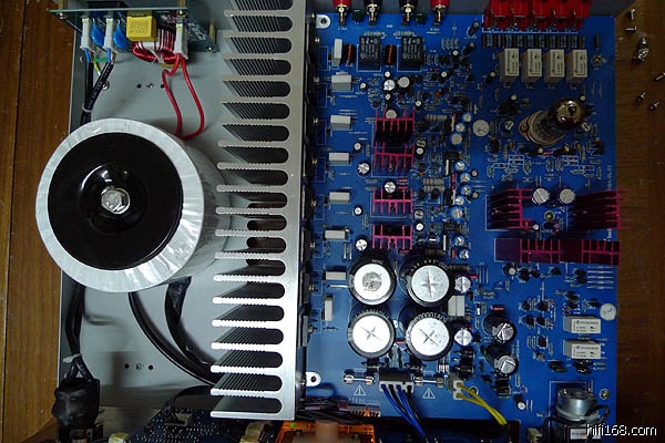 7、后级电流推动级采用甲类推动,因而推动管也要用一块面积较大的散热片,输出级采用高偏流的AB类工作方式,A类与AB类有机组合,既有A类的优点,又能很好解决散热问题,电路稳定可靠。