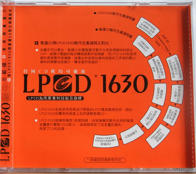 雨果发烧碟推出至今已经是第14辑了,这张《发烧碟14》除了为我们带来好听发烧的音乐之余,还给我们带来了雨果最新推出的母带处理技术——LPCD1630。雨果每次推出一个新的技术都令发烧友们有着耳目一新的感觉,包括之前的LPCD45,LPCD33,当然LPCD45是至高无上的,因为那个是母盘直刻技术,没有经过印碟环节所以损失是极少的,每个发烧友买到回去等于买了张母盘。然而LPCD45价格是相对较高,而且有部分CD机不能正常读取,成为了部分发烧友的心头之痛既爱又恨。     而雨果这次推出LPCD1630的目的在于告诉我们其实压盘出来的CD也能造得很靓声。LPCD 1630技术核心在于采用U-Matic 1630母带,这个U-Matic1630母带可以说是几乎被遗忘的数码产物,在早年的CD生产上所有公司都离不开采用这个U-Matic 1630母带作为交付压盘厂进行压盘的母盘之用。老易向我们解释道,为什么早年的大家所谓的“铁芯版”“西德版”好声的原因很大程度上是归功于这个U-Matic 1630母带。后来因为U-Matic 1630母带设备被淘汰取而代之的则是我们现在用得最多的CDR作为母盘之用,CDR虽然方便,但是在制作玻璃母盘的过程损失却是加大了,这是声音劣化的原因(这点在下面的图片中我们可以见到)。 在这张《发烧碟14》里面一共收录了14段音乐,包括中乐,交响乐,女声,男声,小提琴,一次过可以全面测试这个LPCD 1630带来的音效提升。另外老易还很有心思地在唱片最后加入了两段煲机讯号,一段是5HZ一段是20KHZ,可以让发烧友在买回新器材或者长时间没有使用时作煲机之用。不过特别提醒一点,大家要注意音量,有部分档次较低器材可能因为Cd机或者功放的原因不能重播出5HZ的低频,这时候切勿刻意调大音量可能会导致烧机。 这个就是LPCD1630制作流程图和普通Cd制作流程图的区别,LPCD1630在制作母盘之时是采用1:1玻璃母盘刻录,而且每个金属模只压制1000张,从而确保每张Cd的品质。 这张《发烧碟14》是首版限量发行版本,所以里面还附送了一张曲目一样的普通CD让发烧友和LPCD1630进行比较。经过我AB比较,LPCD1630无论在音场,结像,分析力,密度感都完胜普通CD,而价钱只比普通CD高一点而已,据了解雨果已经有一系列LPCD1630唱片在安排生产,相信到时大家会听到更多好音乐。 试听片段:红彩妹妹
