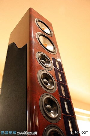 由下仰望Nola Grand Reference的主音柱,真有君临天下之感。请注意它的高音及中音是没有音箱的开放式设计,只有上下各两支低音单体有箱室。将左右两侧黑色的黑色网罩拿开,就可以看到高音及中音单体的背面。