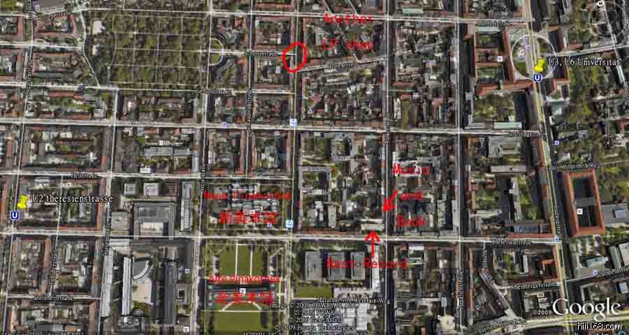 这张图有一点小,从Google Earth上截下来的。可以看到,在Theresienstrasse大街上,西边是两个美术馆。坐U2到Theresienstrasse站也可以。