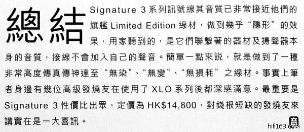 听完这付线,让我兴叹不已。前不久在听过雅图的次旗舰信号线时,曾为其中低频段的出色表现唏嘘半晌,但总觉得如果高频部分再多些糖分和水分会更合我意!没想到这点遗憾今次竟然被XLO Signature 3-1 Singled-Ended Audio Cable所弥补了。看来下一个为之而努力工作挣钱的目标又出现了!