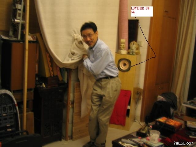 他的现役设备是一对北京老周做的音箱,是一对使用钢琴云杉夹板为箱体的Lowther PM6A音箱,一对WE(西电) 124B后级,一对马兰仕9后级(听说花了14万RMB买的),一对德律风根老调音台上的前级放大器,一部麦拿伦AV处理器当前级兼解码器用,还有一台LINN的LP 12,最后是一台名不见经传的国产"BBG" DVD(约7,8百块钱吧?!),而且机上盖已被拆除,尤如一部被老余凌虐已久的模样,就像被脱光衣服的爱妾(转盘)般.......