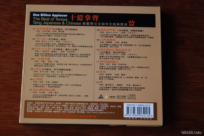 那么现在为什么又向大家推荐呢,缘于刚结束的白天鹅音响展上的一次偶遇。音响展第一天,我拿相机去。拍了不少音展的相片。其中就有徐雯签售唱片的图片。当时看了宣传海报才知道原来她是新加坡人。当时也没有买她的碟。后来,在6楼的一个展场里,听到商家在播邓丽君的日文歌“漫步人生路”,非常好听,配乐也很时尚。当时我问商家拿唱片来看看,准备到海印买一张,没想到是徐雯的《十亿掌声》。我说“哇,真的很象邓丽君”,商家说:“是很象,有八、九成象”。事后,我到海印买了第二辑的《十亿掌声》。我先听了“结识你那一天”(广州话版的“甜蜜蜜”),一开始是有个人在听密纹唱片跟着唱,几十秒后现代的时尚配乐随之流,动听的歌声甜而不腻,非常有HIFI感。乐器的清晰度,音场,空间感都很好。接着的“初次尝到寂寞”,“小村之恋”,“雪中情”,“月亮代表我的心”,“在水一方”,“忘记他”等熟悉的歌曲,配搭新的配乐伴奏,一曲接一曲,将经典的歌曲以HIFI 的形式呈现给大家。如果你不是刻意追求旧时代的韵味,喜欢保留邓丽君的八成韵味而又希望歌曲焕发HIFI的现代音响效果,这张碟就适合你了。随后我又去买了第一辑。两张碟的配乐都是熟悉的团队:小提琴张毅,二胡黄江琴,古筝:付娜,长笛李娟,吉它劳国贤……(怎么跟雨林的一样?)