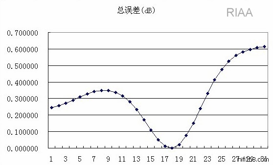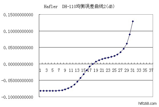 另外这种同相电路方式,增益的大小也会影响均衡误差的大小的。象最后的这款:Hafler DH-110,增益只有22分贝,所以均衡误差较大,如果把增益提高到36分贝,均衡误差会小很多,如下图。但曲线的走向是不变的。