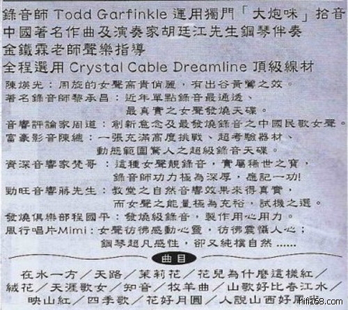 周末晚上,有帮发烧友带了一张歌坛新秀周旋的歌碟来我家,说她这张碟如果音响系统没有调教好的话,重播起来会干瘦尖硬、刺激刮耳,让人烦躁不耐听。他们几家的都播不好,想考我音响系统重播人声的级数去到哪里。周旋这张歌碟高音高亢明亮,我的音响系统重播她的歌,甜润悦耳、富有感**彩、委婉动听,让他们几个专门来踢馆的只好服气地将她的这张歌碟赠送给我。