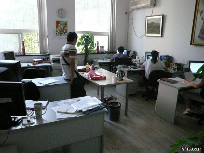 欧博音响公司位于北京一个非常新潮的旅游景点内,就是798艺术区,其前身是北京华北无线电联合器材厂和北京电子管厂,里面的建筑物都是前苏联、民主德国援助建立起来的,所以非常有欧洲的设计氛围,后来这些老工厂倒闭后,有人发现厂房非常有特色,就用来做展厅,结果又不断发展,现在已经成为一个非常小资、有情调的休闲、绘画、艺术、时尚的集散地,也成为了北京都市文化的新地标。