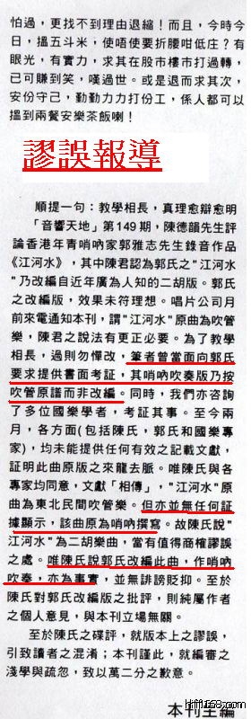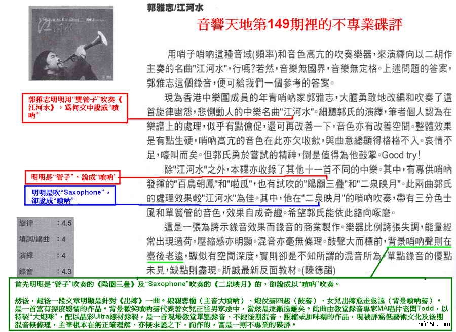原帖由 MissionLu 于 2010-9-12 13:17:00 发表看过陈德韵乐评全文,单就陈君碟评中那句“单点录音的优点未见,缺点则尽现。斯诚最新反面教材”,个人觉得陈君是有目的带攻击性的低水平之作,实无推广弘扬中乐之心,其遣词用句严重缺乏内容和深度。 郭雅志先生於这录音里的《江河水》明明是用“双管子”吹奏,为何陈君说成“唢呐”!?林镇辉主编於文中三道强调郭雅志先生吹奏的是“唢呐”,所以应该不是打错字,陈君听不出来,难道接触过不少中乐的林主编也不懂!?