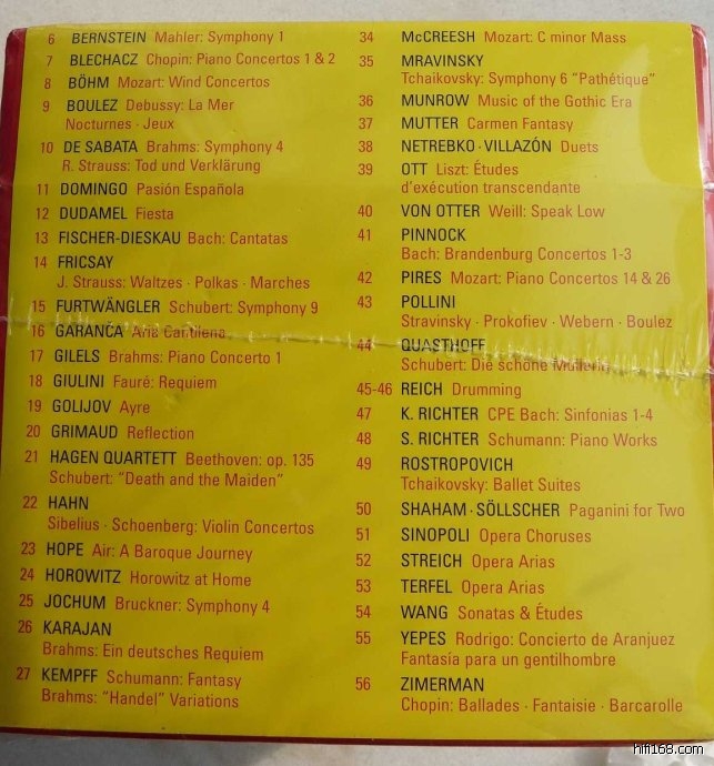 继去年的DG111的55CD后,今年,我入手了被定为下集的DG111 56CD,幸运的是,只有一盘CD,穆特的卡门幻想曲我重复了,不过,我买的是SACD版本。所以,对于我来说,这套纪念版格外有性价比!只要800元!由于这个套装限量供应,而且,高仿版可能正在制作中,所以要买请趁早。下面我为大家介绍一下这个套装。