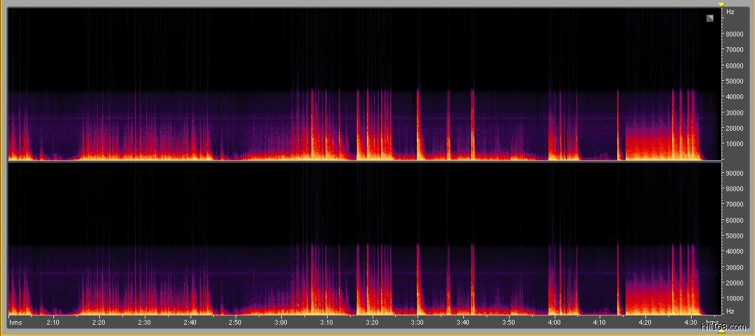 可以看出24bit-96kHZ之LP-WAV音频频响明显要宽,高频达到了32kHZ,听音感觉也是如此,CD音频实际上将22kHZ以上的高频截掉了,严格意义上来说,CD音频并不是无损音频。