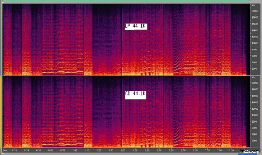 http://music.88bx.com/viewthread.php?tid=48597&highlight=%BA%DA%BD%BA),供大家试听和比较。 另一个网友jmlcy(在19楼)发布了这些音频的频谱图,让我们比较直观地了解,黑胶转录与CD音频的区别。如果这些频谱图是准确的,黑胶转录受欢迎就找到了科学的根据,而不仅仅主观的感觉了。希望有条件的朋友验证一下。