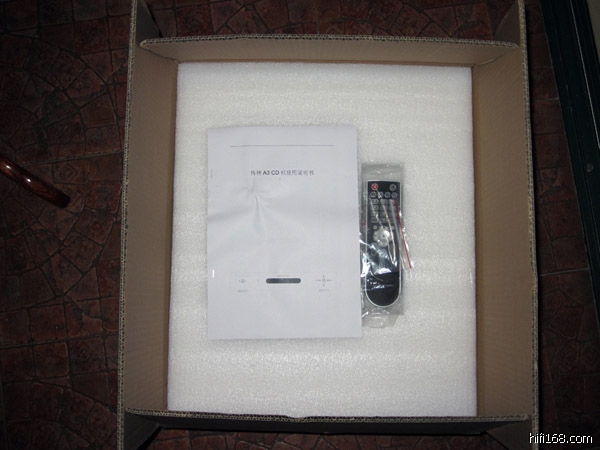 打开双层纸箱后,首先印入眼帘的是一层厚厚的白色珍珠棉减震层,嵌入中间的是遥控器、电源线和CD镇子,遥控器就如大家所看到的,就像VCD机遥控器一样,轻飘飘的没有手感可言,因为我家的CD机遥控器和这个机器遥控器红外频率相同,所以在试听的时候就没有使用随机的遥控器;电源线的质量也有提升的空间,从手感和目测来看好像还没有较好的电脑机箱线质量好,我想讲究一点的买家会把这个鸡线换掉。