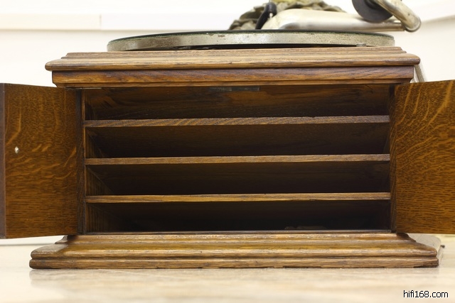 它的设计非常巧妙,它的木质箱体本身就是一个扩声迷宫,它既可以作为唱片的贮存箱,又是一个发声体,有趣的是,声音的大小是通过箱体上的两扇门的开合角度控制的。