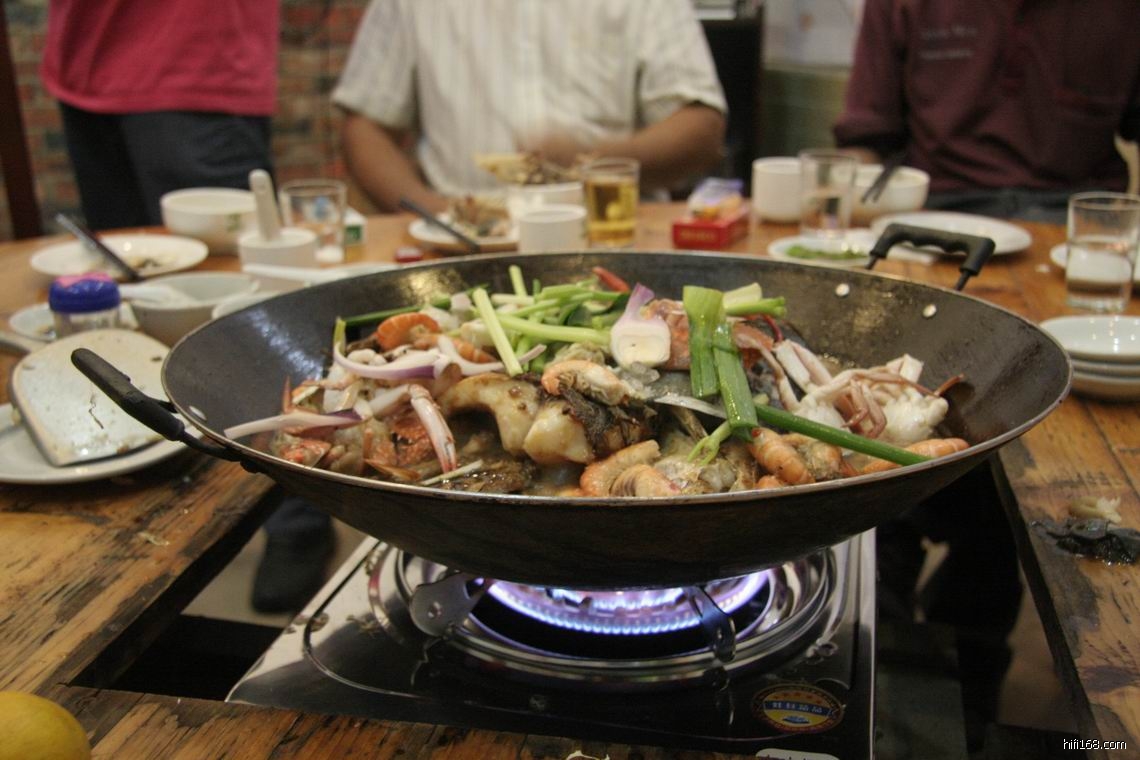 第二道是海鲜醉大鱼,这道菜要多等一些时间,加热后要放一支半米酒煮沸,然后在盖子边点燃等里面的酒精燃烧完才进食,火光雄雄十分壮观。