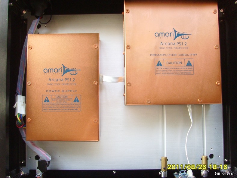 1、2009年11月购于原厂,实际使用100小时左右。外观很新,没有任何划痕,全铝机箱(不仅顶盖和底板,四面都是铝板制作,要打开顶板需要从底板上卸下螺丝,类似于美国“怀念”的做法),内部电源与主放大部分分离并施以铜盒屏蔽,主放大部分还用了橡胶垫材隔离底板震动;