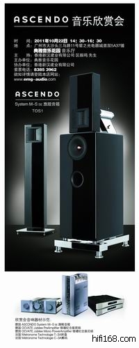 2011年10月22日典雅音乐花园将会举行德国“ASCENDO”音乐欣赏会,活动现场将会播放多张极具珍藏价值的CD软件让各位爱乐人士可亲身体验来自德国贵胃品牌ASCENDO system M-S SE音箱系统的真正实力!门票有限,有意者请到典雅音乐花园免费索票!时间;2011年10月22日 14:30-16:30地址:广州市大沙头三马路11号星之光电器城首层5A37号 典雅音乐花园索票电话:83853962若需了解更多详情可登录本司网站:http://www.emg-audio.com/