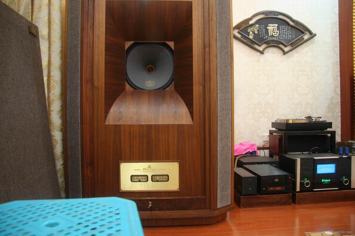 刘生将JBL 4343音箱换了英国TANNOY (天朗)皇家西敏寺同轴音箱,Westminster Royal/SE装载了一个全新的38cm同轴单元,中/低音单体采用混以弹性纤维的纸盆做振膜,对中频声音的重播效果有了较大幅度的提升,能提供更好的中、低音的质感。同轴高音为新开发的24K金振膜高音,采用先进的磁钢Alcomax 3型作为单元磁体,具有极强的驱动能,通过提高驱动力从而实现了忠实原音的高音质再现,音色更加通透。配合经过新改良的高音单元导波管,令高频与中、低频衔接更完美。