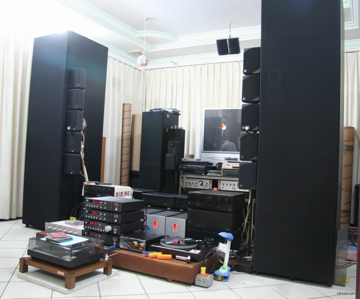 礼哥自行设计和打造一对有46只喇叭的巨无霸音箱,冒昧到访的烧友不计其数,声音表现不错,深深被他的动手能力所折服。礼哥的器材已经报道过很多次,现不再重述,不过今次他新添置了一台质素非常好的英国EAR 88PB胆唱放,终于见到他的大系统出现胆的踪迹,是一个好的开始,期待进一步的靓声。