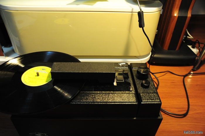 然后把吸嘴轻轻放到唱片上。这个吸嘴有两个作用,一是向唱片上喷洗碟水,然后再吸干净。