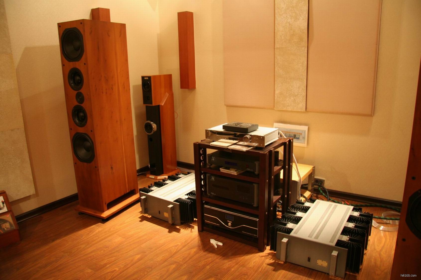 房间的器材由:Forsell Air Reference CD转盘,Rogors(乐爵士) Highe Fidelity CD解码器,JEFF Rowlad(乐林) COHERENCE晶体管前级,FM 600A晶体管后级,Marter(马田) MILES II陶瓷喇叭落地箱等组成。