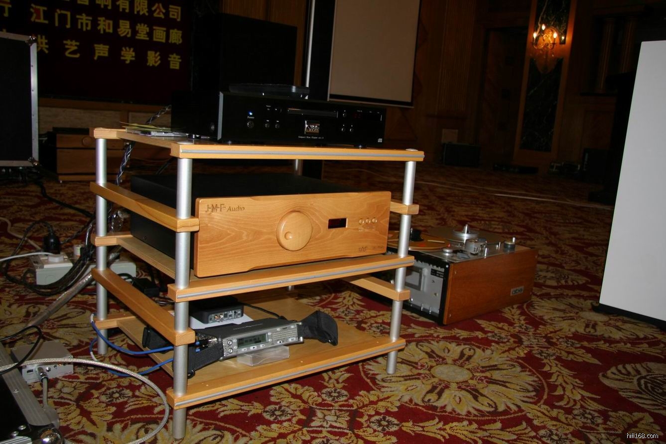 7月8日那天重头戏在银晶酒店多功能厅近400平方米的空间举办:江门音响协会成立八周年庆典活动。富盛向发烧友们展示号称“无限承受功率”的Wisdom Audio美国扬声器系统,JMF-Audio晶体管功放,JMF-Audio 晶体管前级、解码器等。