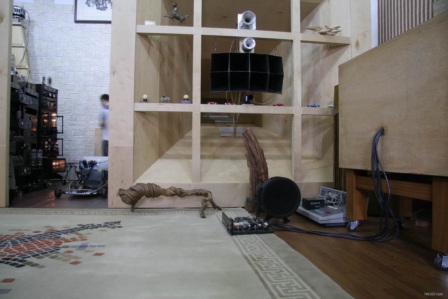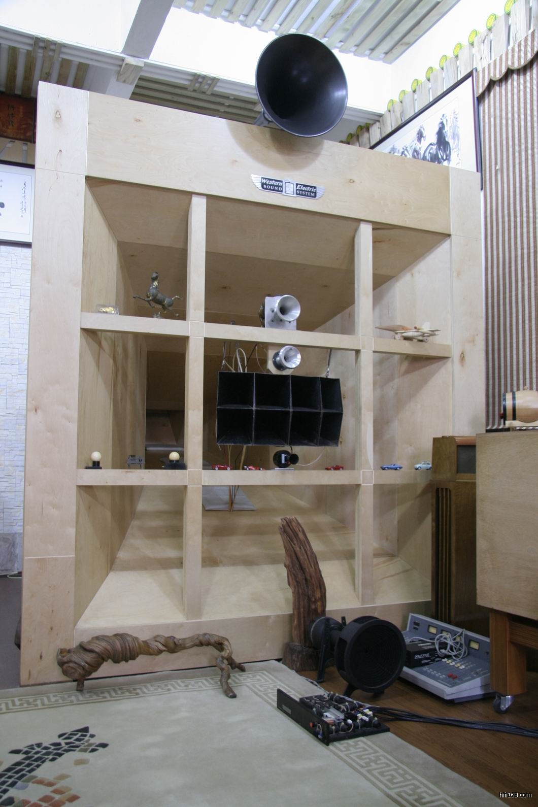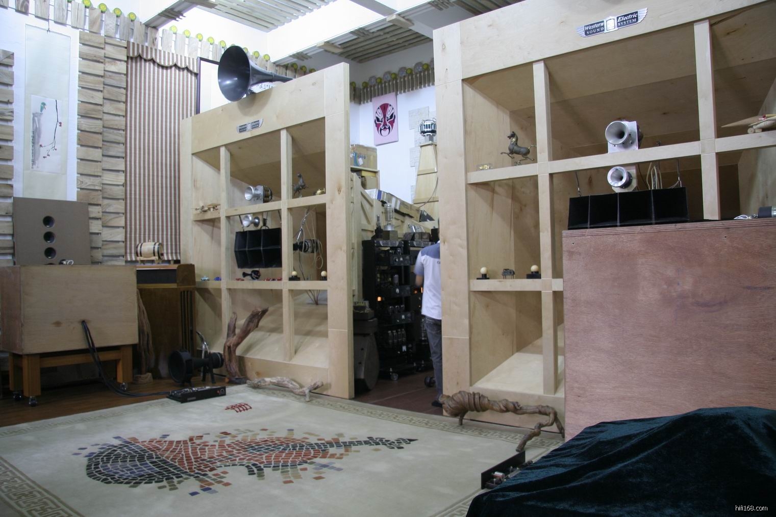 这对号角障板单只宽3米,高3.2米左右,是我见过最大的了,没有这么大的听音室是放不下,真佩服伟哥的构思。