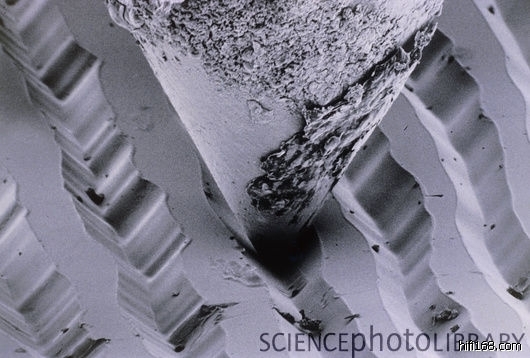 唱纹上有无数的小颗粒,这些小颗粒有的已经被嵌到唱纹里了,有的可能刚刚落到唱纹上,而这些新落上的小颗粒在唱针的带动下可能会直接蹦出唱纹,也可能最终会被嵌到唱纹里,而这些嵌到唱纹里的小颗粒就会带来针尖不应该有的震动,也就是炒豆声