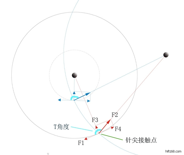 内侧力是由于T角度的补角的存在(在A、B两点时,这个补角等于唱臂的补偿角),而导致臂杆的拉力与针尖受到的摩擦力不在一条直线上,那么臂杆拉力就会有个F 3的分力,这个力就是针尖受到的向心力的来源。这个向心力可以通过直接求解F3来得到,也可以换用另一个公式来计算,那就是:向心力的大小与运动物体的质量、角速度还有半径有关,唱盘转速恒定,即是说角速度恒定,唱头唱臂的有效质量也是恒定的,那么向心力的大小就与回转半径成正比,越往内圈回转半径越小,向心力越小,也就是说内侧力越小!