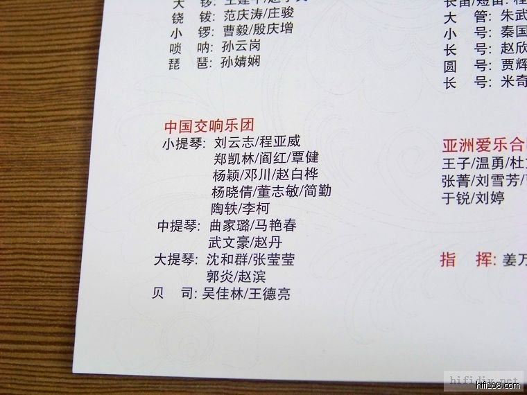 看了一下此碟录音的演奏团体,牌头都很大-----中国交响乐团、中国爱乐乐团、亚洲爱乐合唱团、中国戏曲学院。