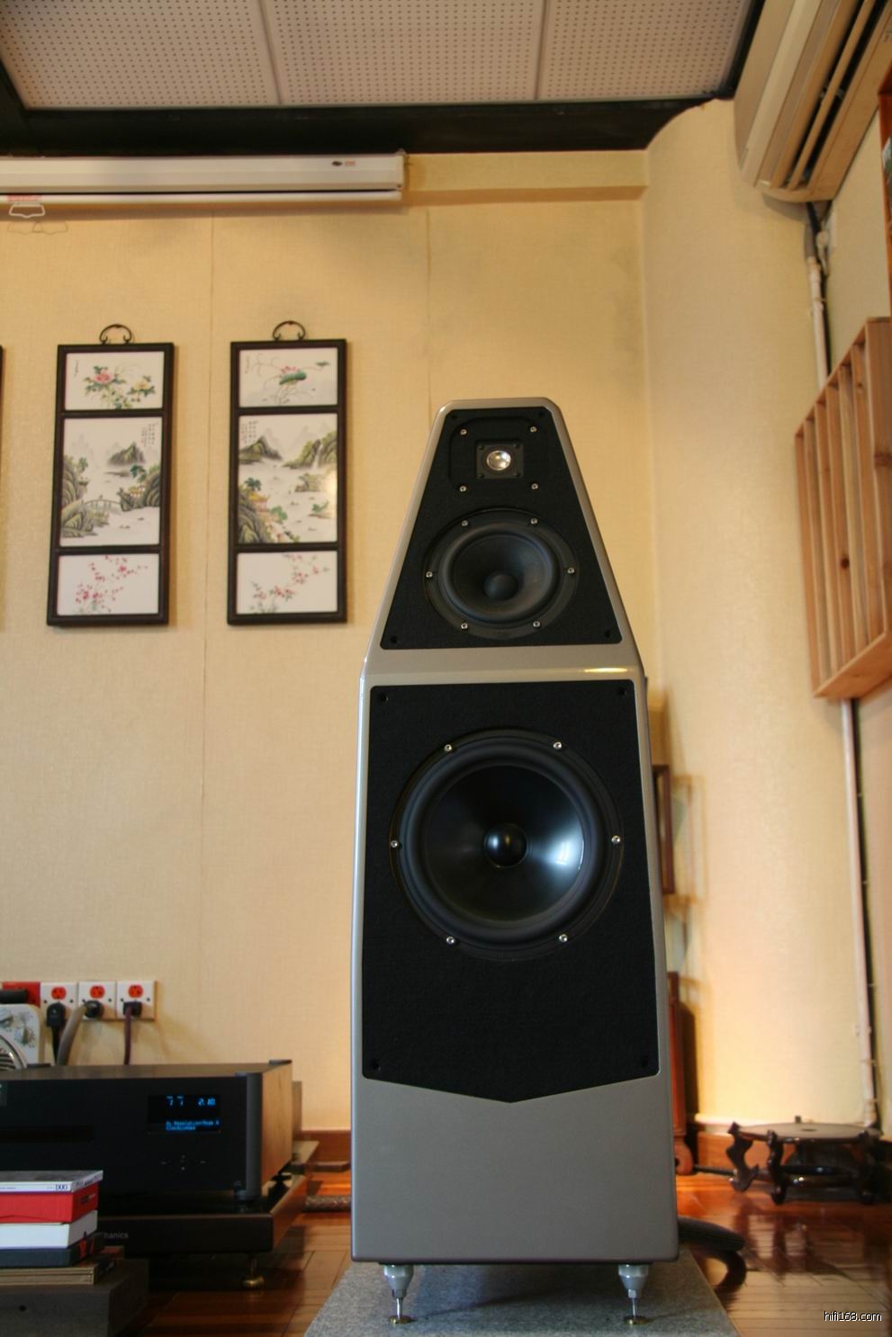 黄生那对Wilson音箱下面的石板不是直接放置在木地板上,因为直接放在上面是不会平行的,所以在木地板与石之间放了几块细小金属垫,稳如泰山。