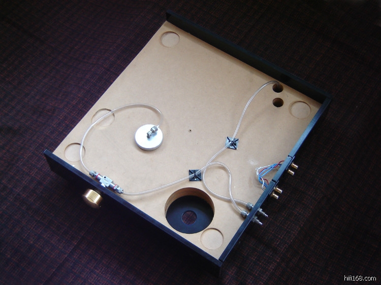 这套系统就是一体机参考唱盘升级“空军一号”,拆去参考唱盘内的马达(唱盘台面的左后方还能够看到一体机安装马达轴头的圆孔)。