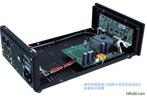 至于机器内部,实际上机身后半截没有什么东西,电源从后方进来之后直接传送到机身前半段的变压器,变压器做了完善的屏蔽,确保不影响到解码线路的稳定。解码部分的所有芯片都竖立起来密密麻麻地安在前面板内面,解码之后通过长长的信号线输送到后端的接口,不过这条线本身做了良好的屏蔽措施,而且放置在机器最右边,离电源变压器有一段距离,因此受到的干扰也降到最低。至于芯片部分,接收用的是X-MOS XS1 LS1,解码部分用到了德州仪器的TAS1020b,DAC 15使用的USB传输方式是异步传输。