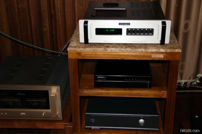 Accuphase DP-75V:售价约58000HK$。此机是在原DP-75的基础上改进而来的新款,中置式转盘,CD托盘用两个转盘锁锁紧,电源有两只多绕组密封牛,各部分以金属板隔离,光头拾取的数字信号经金嗓子的R F微放大器再送入滤波电路,DAC用多重Delta Sigma(MDS)共6枚芯片组成并联式全平衡线路,左右声道各用两块直立的解码线路板,据说可对付未来的SACD及DVD Audio数码输入,可能是要额外加一块ADB2的数码输入板,就可兼容DVD Audio或SACD,再配合Accupase厂自家的Ultra jitter free PLL Circuit线路,减小jitter失真,全平衡的模拟输出信号设数码音量控制。香港写手称它全频的透明度和细腻度超凡入圣,直逼合并式CD机王L inn CD-12。