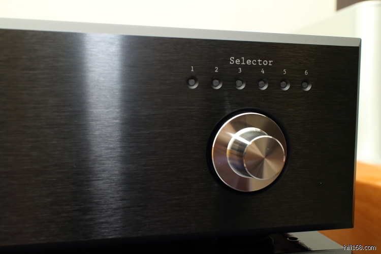 解码机箱方面,面板设计也非常简洁,面板右面有一个银色的旋钮,这个是讯号选择开关,旋钮上面有6个LED指示灯,分别代表了6个不同输入接口。面板的中间有一个小屏幕,这个屏幕用于显示输入讯号的采样频率,但是显示时间很短,当信号锁定后大概3-5秒左右就熄灭,平时一般处于不显示状态,只有当输入讯号变更时候才会显示。